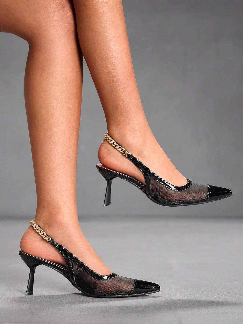 CUCCOO SZL Zapatos de tacón alto con punta afilada para mujer, con decoración de cadena metálica, parte superior de malla, forro rojo sexy, diseño elegante sin respaldo, sandalias con tacón asimétrico
