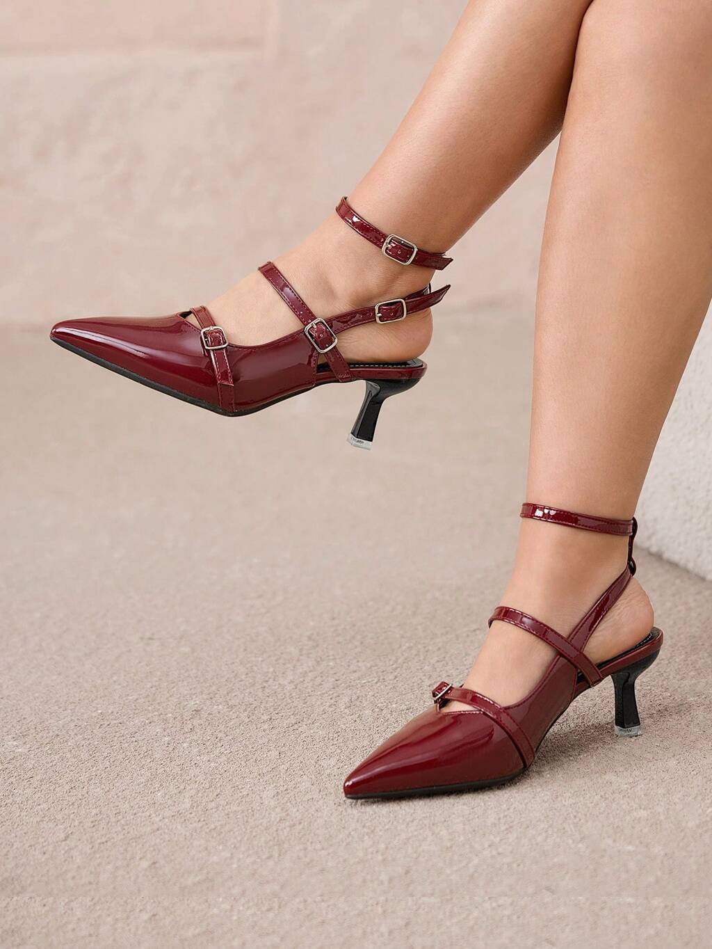CUCCOO CURVES Zapatos de tacón alto con puntera puntiaguda, correa de tobillo y correa trasera deslizante decorativa en burdeos, versión ancha elegante para el Día de San Valentín