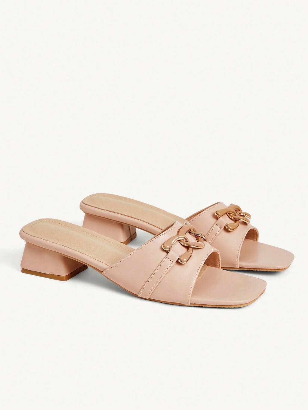 CUCCOO BIZCHIC Tacones tipo mula con puntera cuadrada, tacón grueso, decoración de cadena metálica y suela color café, zapatos de tacón alto versátiles y de moda para mujeres