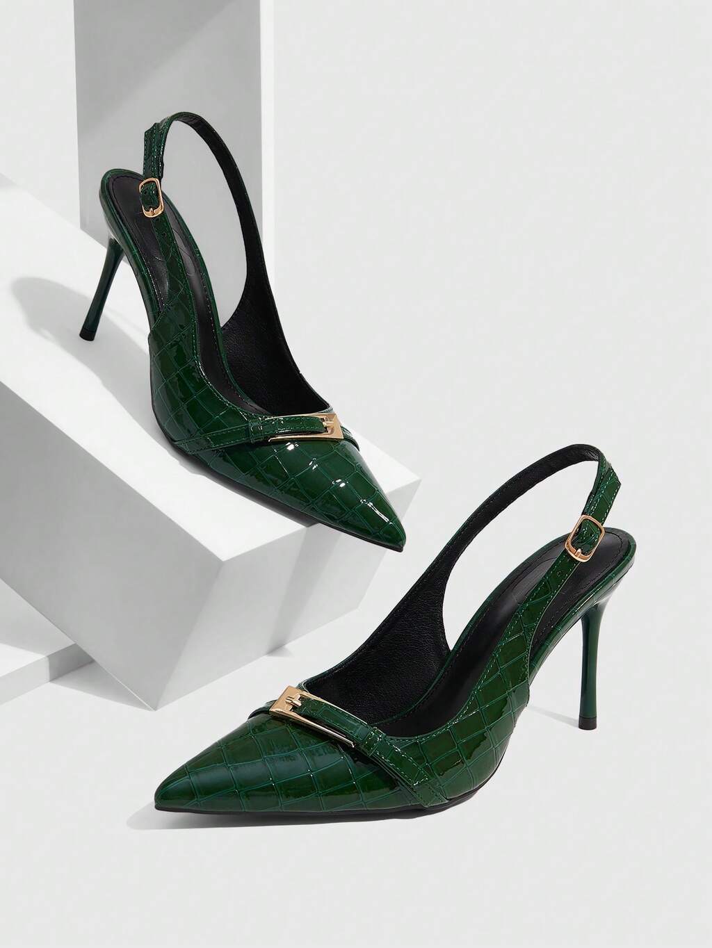 CUCCOO SZL Zapatos de mujer para las cuatro estaciones, nuevos zapatos de tacón de aguja con puntera puntiaguda y patrón de cocodrilo, zapatos de tacón alto con botón metálico y espacio trasero versátiles para el trabajo