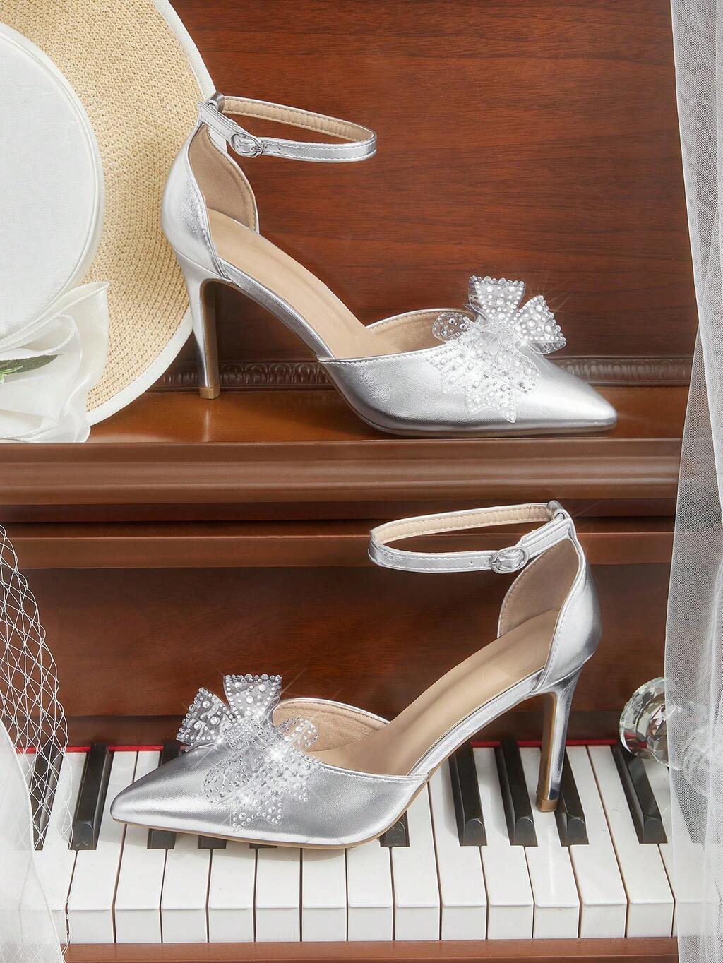CUCCOO SZL Talons hauts à bout pointu épais en argent pailleté avec bride à la cheville. Chaussures à talons hauts sexy et élégantes pour soirée, avec découpes ajourées.