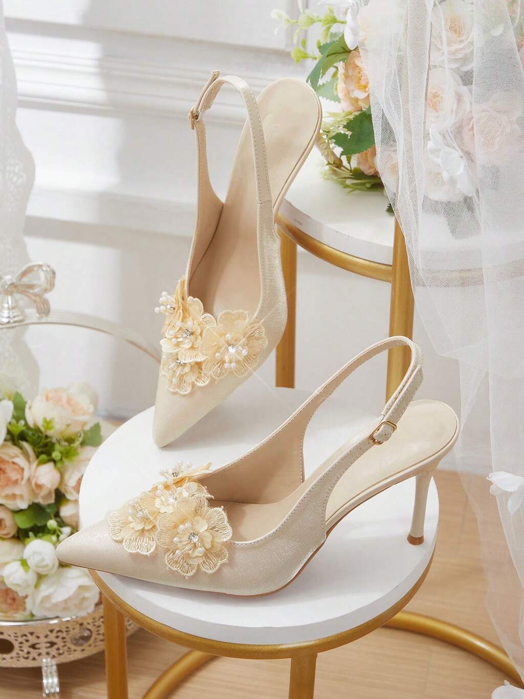 CUCCOO HITCHD Chaussures femme Chaussures à talons aiguilles pointues Chaussures de mariage de soirée de fête de mode à fleurs en dentelle de perle de strass abricot Chaussures à talons hauts élégantes pour la Saint-Valentin