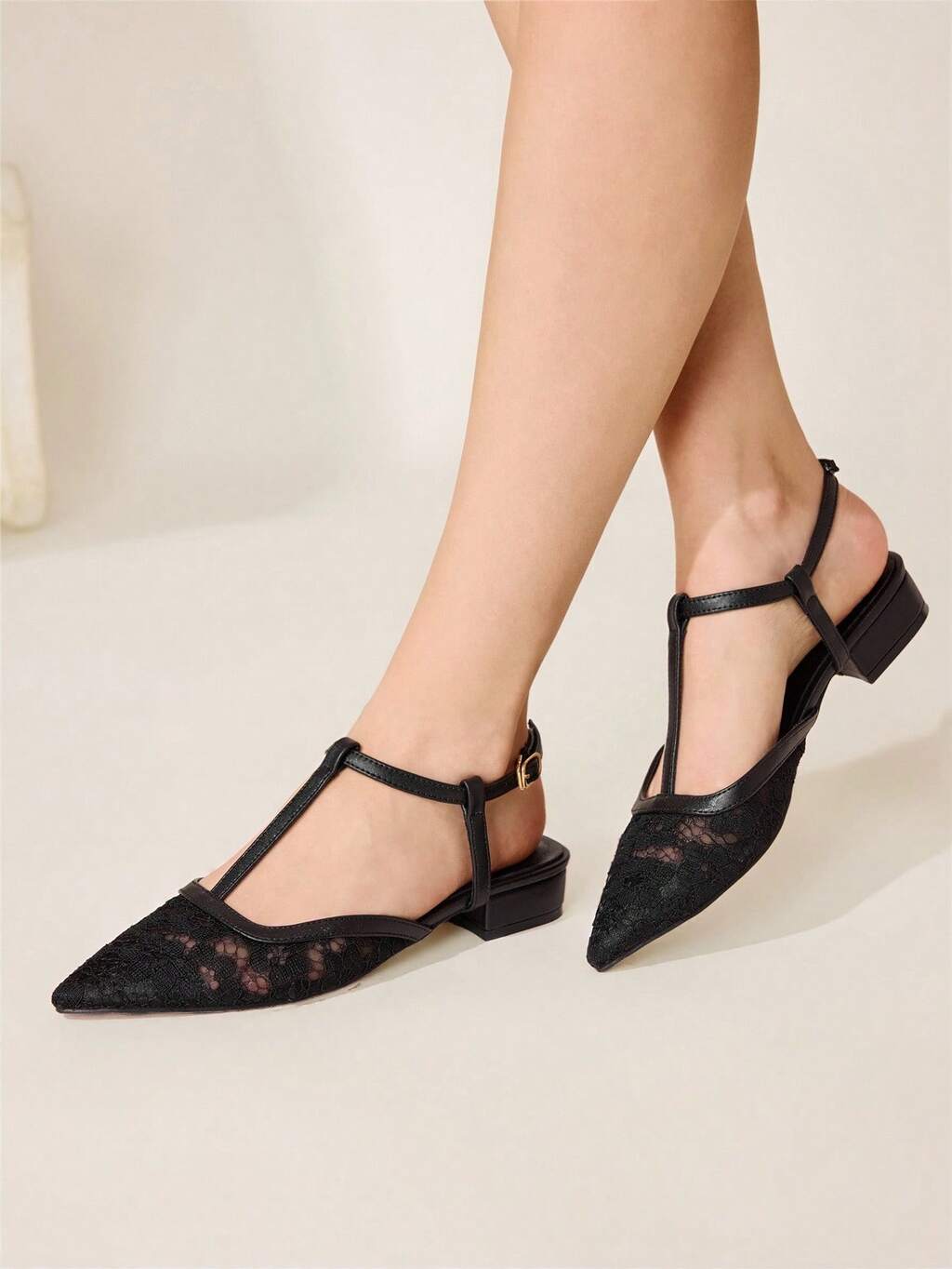 CUCCOO CHICEST Sandales à bout pointu à talon bas en dentelle noire pour femmes, avec insert en maille, bride de cheville respirante avec boucle métallique ajourée. Convient pour le lieu de travail, les déplacements, les sorties, le port quotidien. Élégantes et raffinées.
