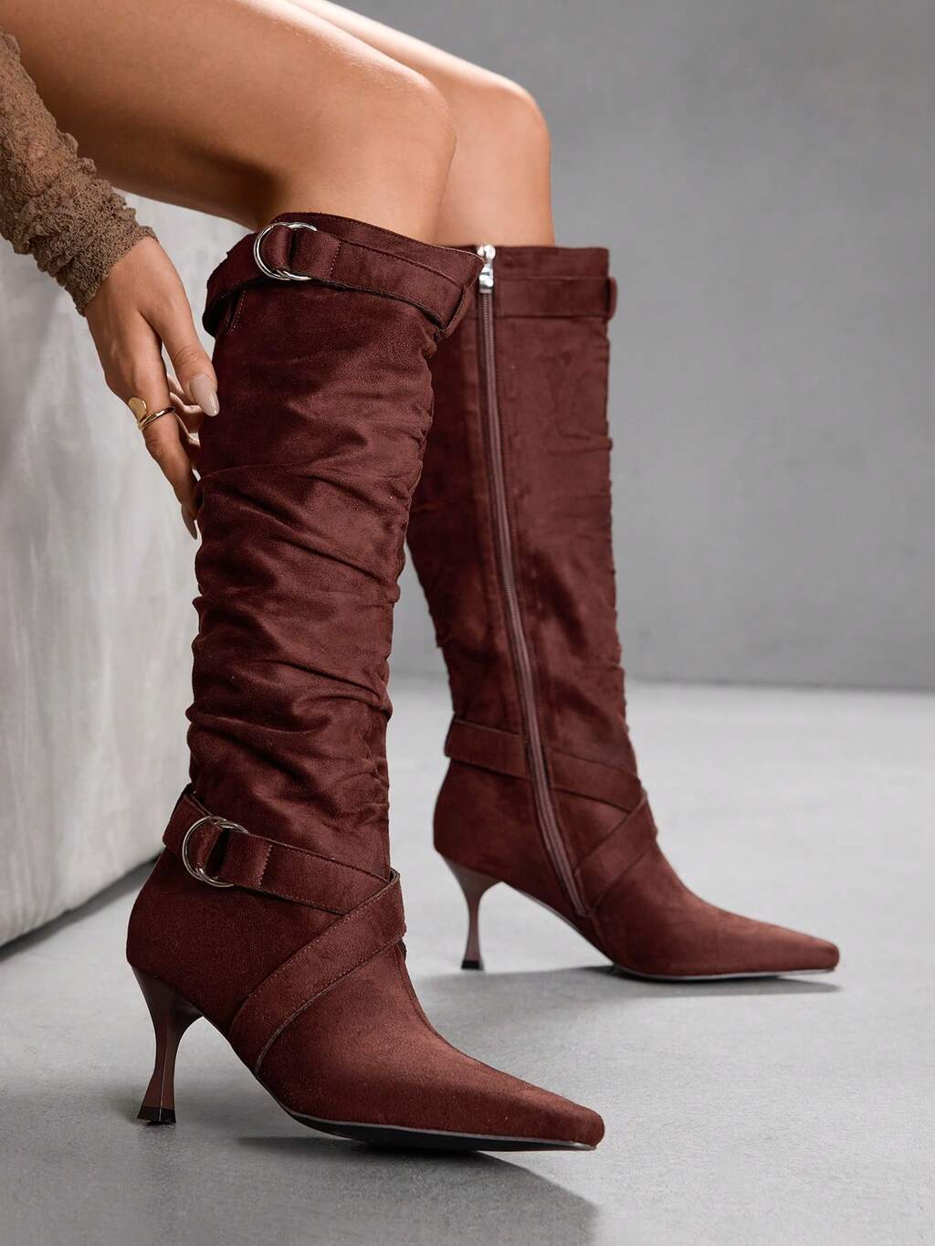 CUCCOO BIZCHIC Brown Pointed Toe Slip-On Ruched Suede Mid-Calf Boots, Fashionable High Heels, Comfortable & Versatile For Daily Commute For Christmas