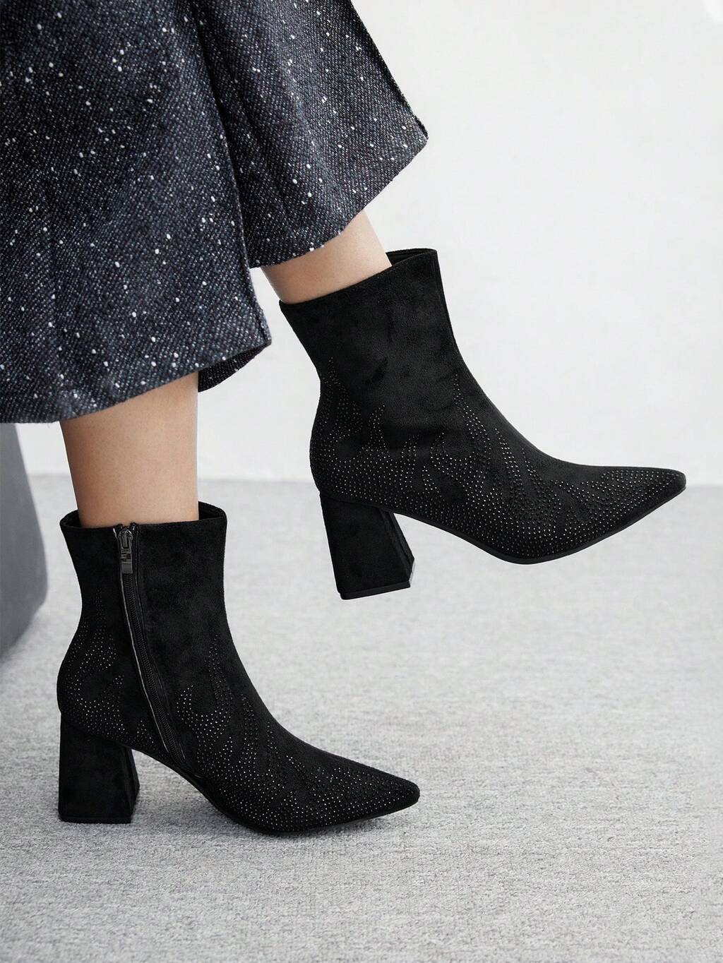 Women Rhinestone Decor Point Toe Stiletto Heeled Classic Boots, Fashion Outdoor Faux Suede Boots
