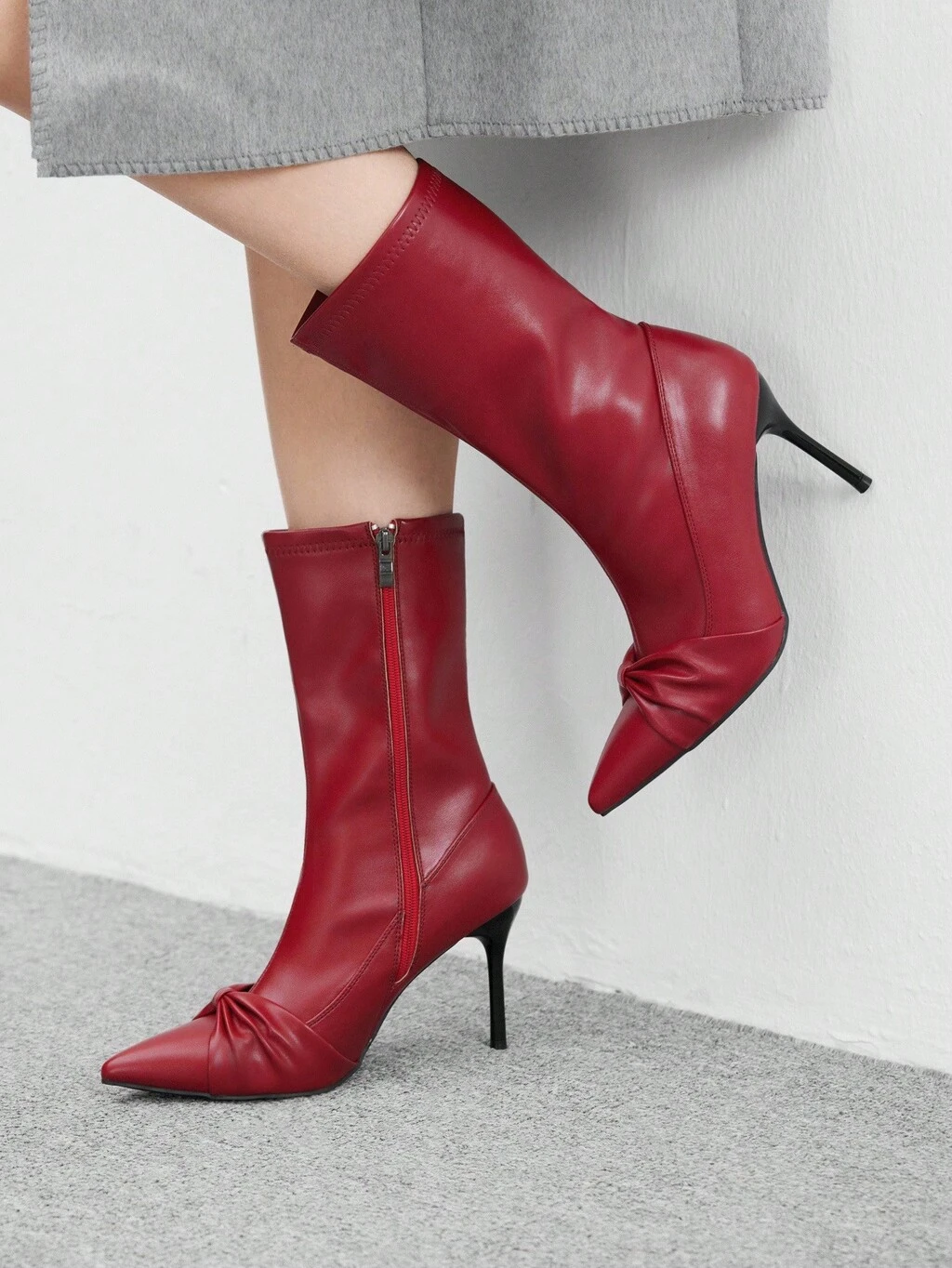 CUCCOO BIZCHIC Burgundy Pointed Toe Stiletto High Heel Slip-On Pleated Suede Mid-Calf Boots, Comfortable Versatile Women's Ankle Boots For Daily Commute For Christmas