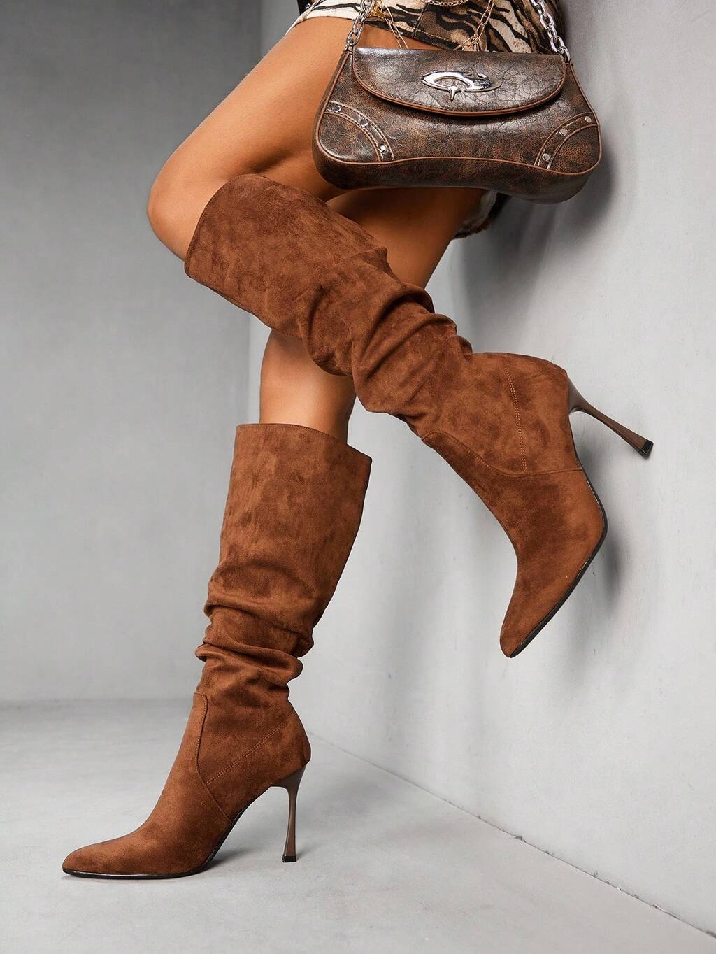 CUCCOO SZL Brown Side Zipper Pointed Toe Stiletto Heel Silver Button Fashionable Knee-High Boots For Women