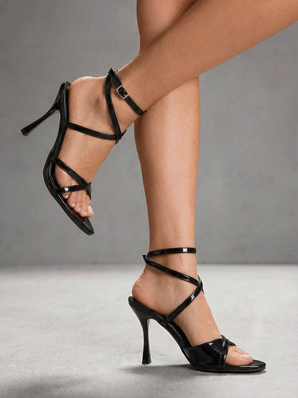 CUCCOO SZL Sapatos Femininos Clássicos Moda Feminina Sandálias de Salto Alto Pretas de Couro Envernizado com Strass, Tira Cruzada, Salto Fino, Bico Quadrado, Ideal para Jantar, Trabalho, Passeio e Encontros Sexy