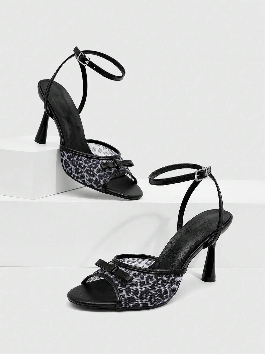 CUCCOO SZL Sandálias de Salto Alto com Estampa de Leopardo e Laço de Tule para Mulheres, Saltos Stiletto Versáteis e Sexy para o Verão