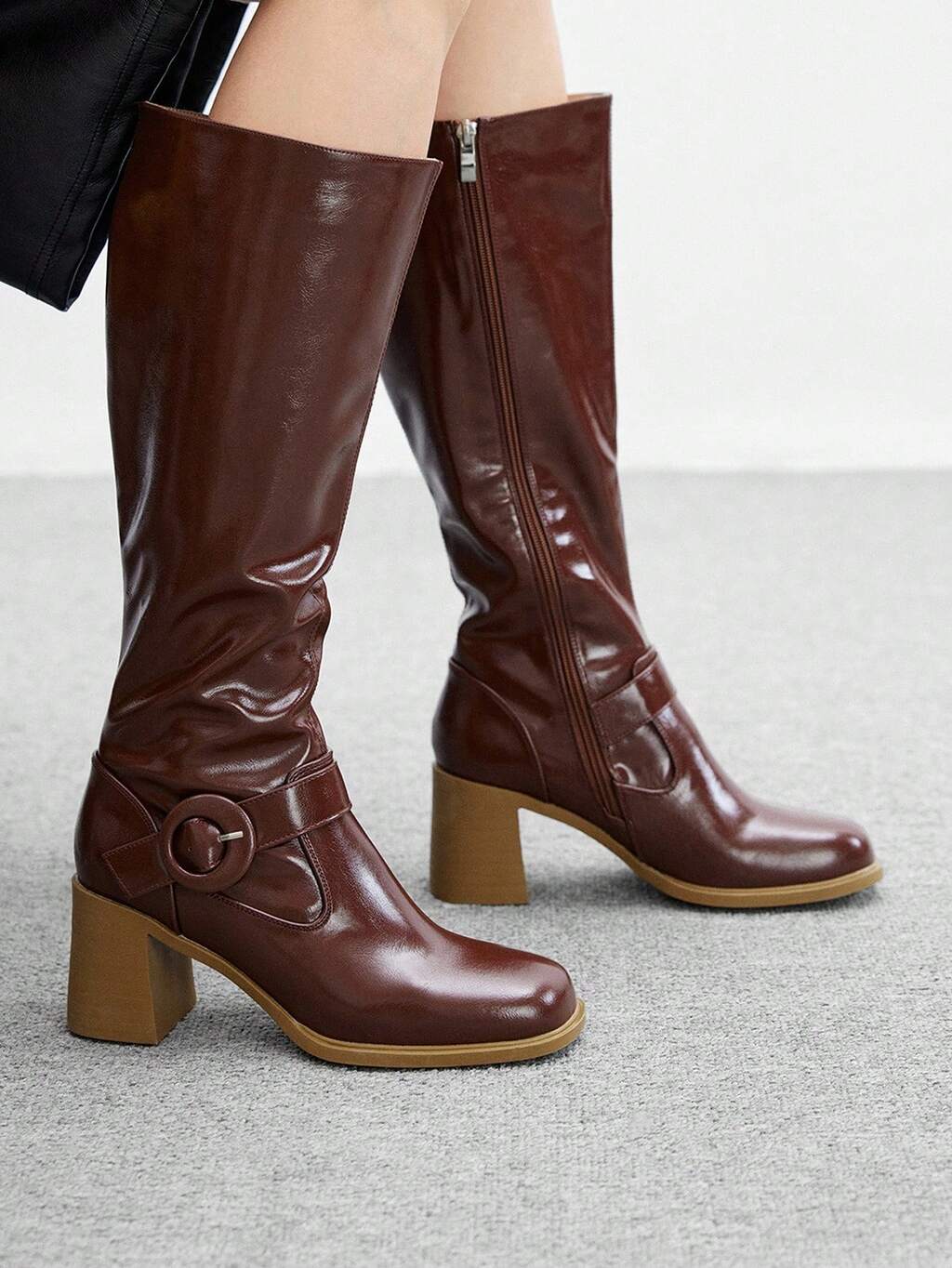 CUCCOO BIZCHIC Women's Fashion Over-The-Knee Boots, Square Toe Chunky Heel Design, Solid Chocolate Color, Side Zipper With Multi-Strap Design, Versatile With Skirts, Jeans, Coats, Suitable For Autumn/Winter, Fashion Shows, Commuting, Stylish Women's Tall Boots