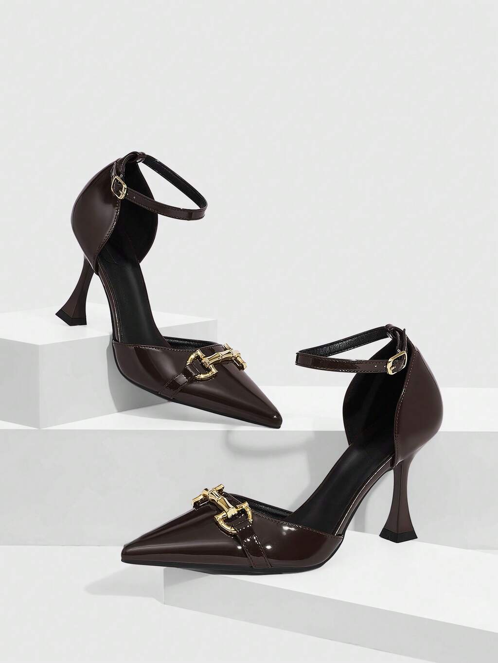 CUCCOO SZL Women's High Heels Brown Pointed Toe Back Top One-Word Buckle Adjustable 9CM Women's Elegant Stiletto Mirror PU Material Metal Bamboo Buckle Decoration Brown High Heels Fashionable Versatile Suitable For Daily/Party/Christmas Valentine's Day Dating/Commuting/Formal Women's Shoes